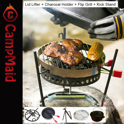 60010 美國CampMaid 12吋鑄鐵鍋+四件組-三腳荷蘭鍋烤架+夾式炭盆+鍋蓋架兼起鍋勾+BBQ烤網兼內網架