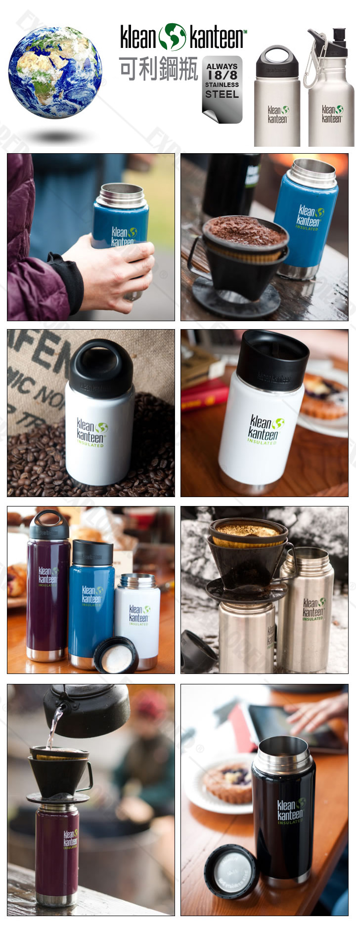 全新的設計為消費者帶來高效能的保溫鋼瓶,重量輕,易攜帶且多功能, 期待已久的Kanteen™寬口保溫瓶 正式加入我們的產品線 不僅是個水壺,您也可以拿它來當做一個超堅固的保溫馬克杯使用 不論您是陸戰隊員,運動員,低脂主義者,喜愛卡布奇諾,品酒師,Kanteen™ 可利保溫瓶永遠是您最佳的伙伴 54mm寬口設計,方便填充及清洗,雙層真空保溫,保持飲品的美味口感。 當我們實測全新的保溫瓶,它的效果遠遠超出我們的預期,甚至令人驚訝 我們首先在室溫下填裝一半的冰水和一半的冰塊,冰塊需要超過24小時 才能完全融化,也就是說,我們可以整天享用冰涼的飲水更重要的是,表面完全不會有凝結的水珠產生接下來,我們嘗試另一種我們最喜歡的飲品 - 現煮的熱咖啡。三個小時後,咖啡還是熱氣騰騰, 經過八個小時,咖啡正是香濃可口。 所有Kanteen™寬口保溫瓶皆附有防漏不鏽鋼環蓋, 內側為100%的不鏽鋼,使用者可把它任易扔易到口袋或背包而沒有後顧之憂。 我們更提供另一個貼心的配件Café Cap咖啡杯蓋 讓您的保溫瓶也可當做咖啡馬克杯使用,並適用於置杯架或單車架。就如同每個 Klean Kanteen™產品,可利保溫瓶採用高品質,食用級18/8不鏽鋼製造。圓角及大螺紋的設計易於清潔,這意味著永遠保持飲料的新鮮美味。 即使長期使用高酸性或熱飲,也完全不會釋放雙酚A鉛,鄰苯二甲酸鹽和其他有毒物質。完美的塔配您每天上下班或戶外冒險使用,Kanteen™ 寬口保溫瓶是您最佳的選擇,因為它是一個真正的通用型高效能水瓶。 - 保溫效果長達六個小時