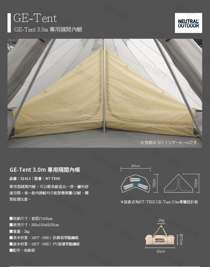 NT-TE05 日本NEUTRAL OUTDOOR GE-Tent 3.0m 專屬隔間帳 蒙古包 印地安帳 吊掛內帳 蒙古包 印地安帳 聚會帳