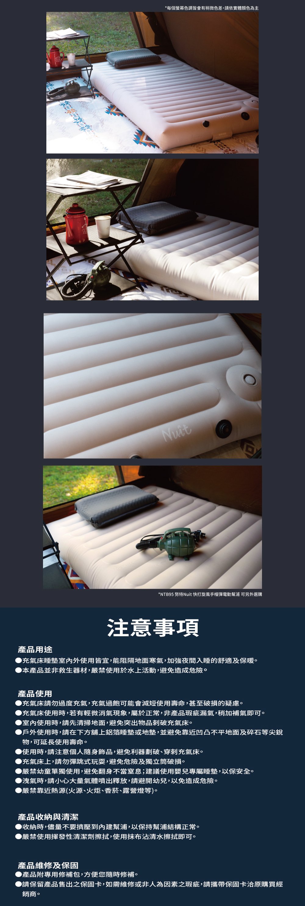 購買前請注意:充氣床屬個人衛生用品,若於充氣後且非新品瑕疵,需視狀況支付產品整新費用,最高約為產品售價之3成,若有人為破壞則需另計價。