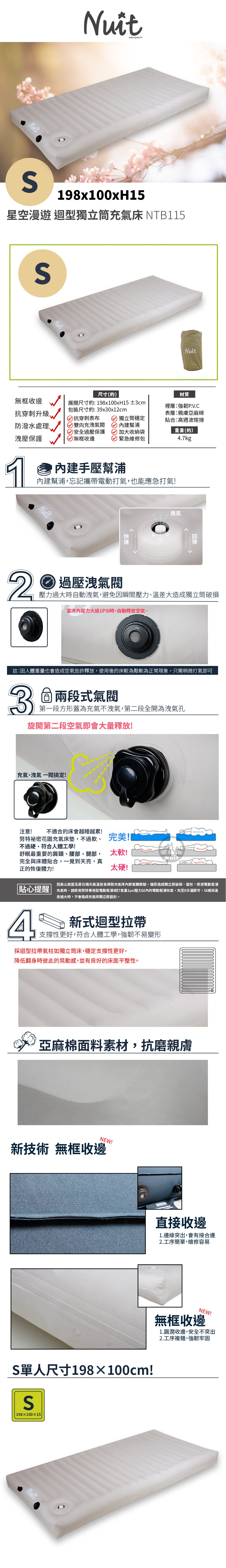 NTB115 努特NUIT 星空漫遊 迴型獨立筒充氣床 S 迴型拉帶充氣床墊獨立筒床墊戶外露營床單人充氣床宿舍辦公室外出旅遊加床