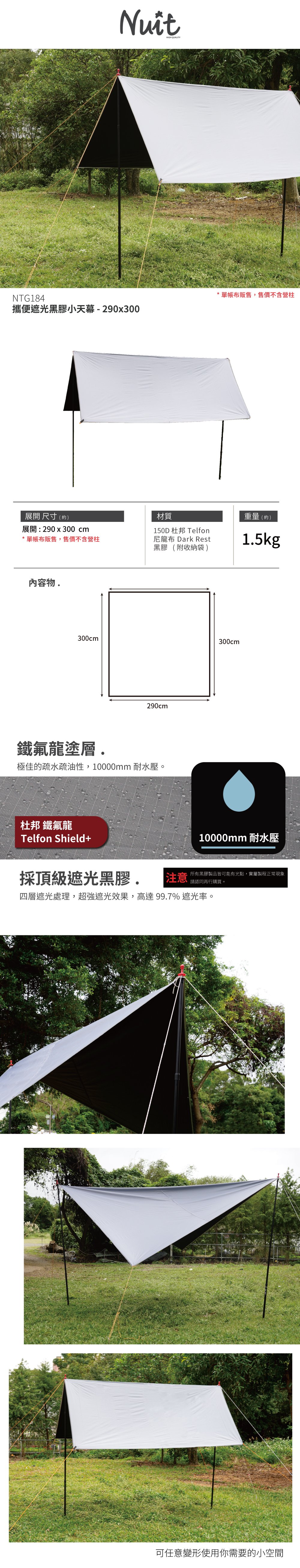 NTG184 努特NUIT 攜便 遮光黑膠小天幕 290x300cm 耐水壓 梯形 遮陽天幕小天幕