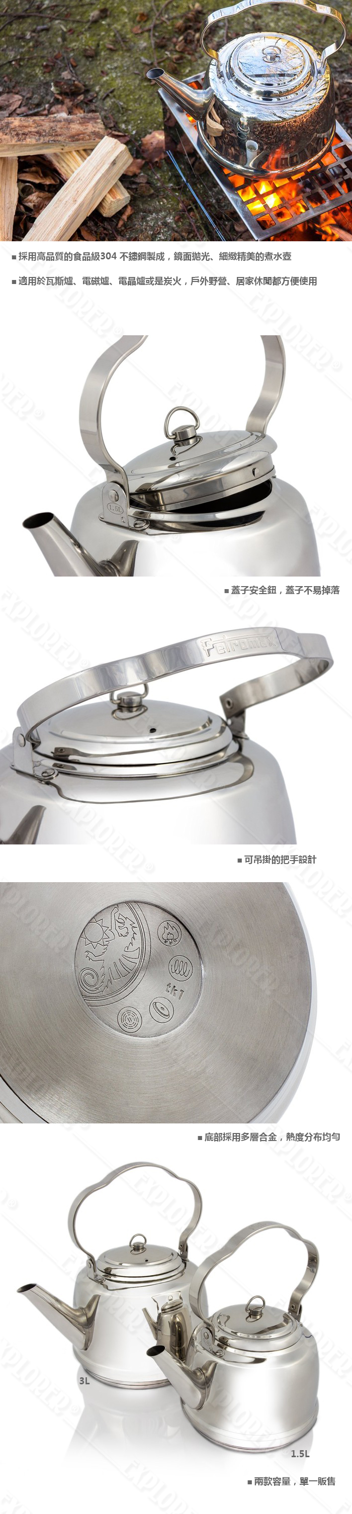 ![]() ※採用高品質的食品級304不鏽鋼製成,鏡面拋光、細緻精美的煮水壺 ※底部採用多層合金,熱度分布均勻 ※適用於瓦斯爐、電磁爐、電晶爐或是炭火,戶外野營、居家休閒都方便使用 ※可吊掛的把手設計 ![]()