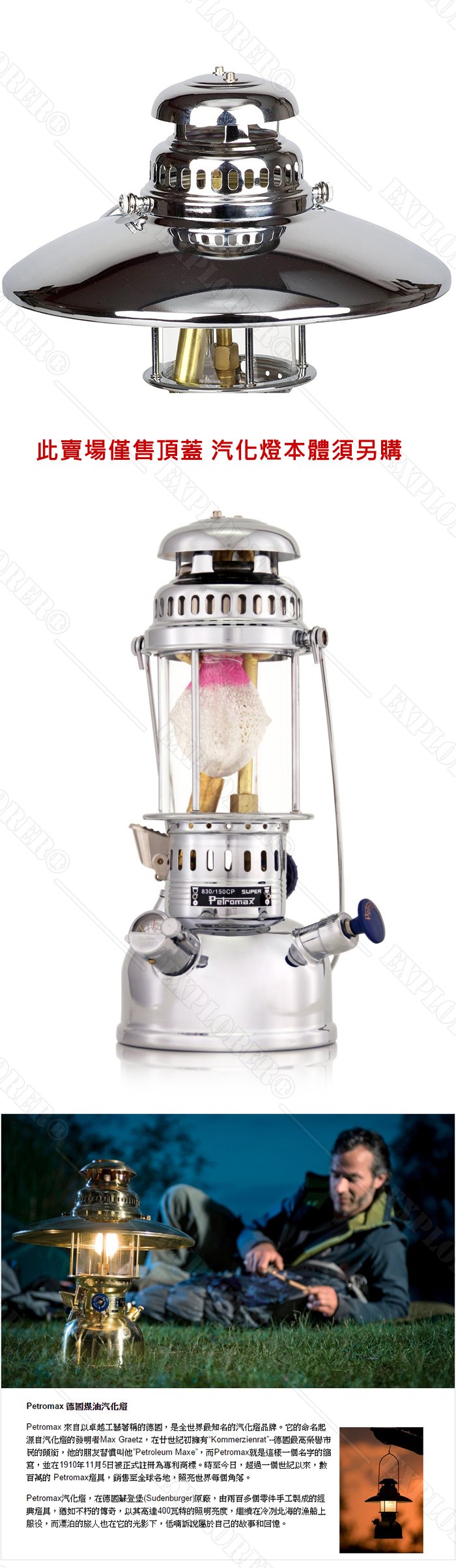 ![]() ● 德國 Petromax HK150 煤油汽化燈的專用反射頂蓋,可避免光線發散。 ● 圓盤狀的設計,直接掛載在汽化燈上。