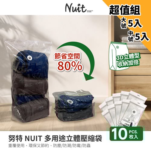 【限時特惠超值十入裝-5個大號+5個中號】NTE6110070 努特NUIT 天際無限 高品質立體壓縮袋100x70cm 真空收納 立體 3D加大 多用途壓縮袋 收納袋 防塵 防霉 防潮 衣物壓縮 棉被