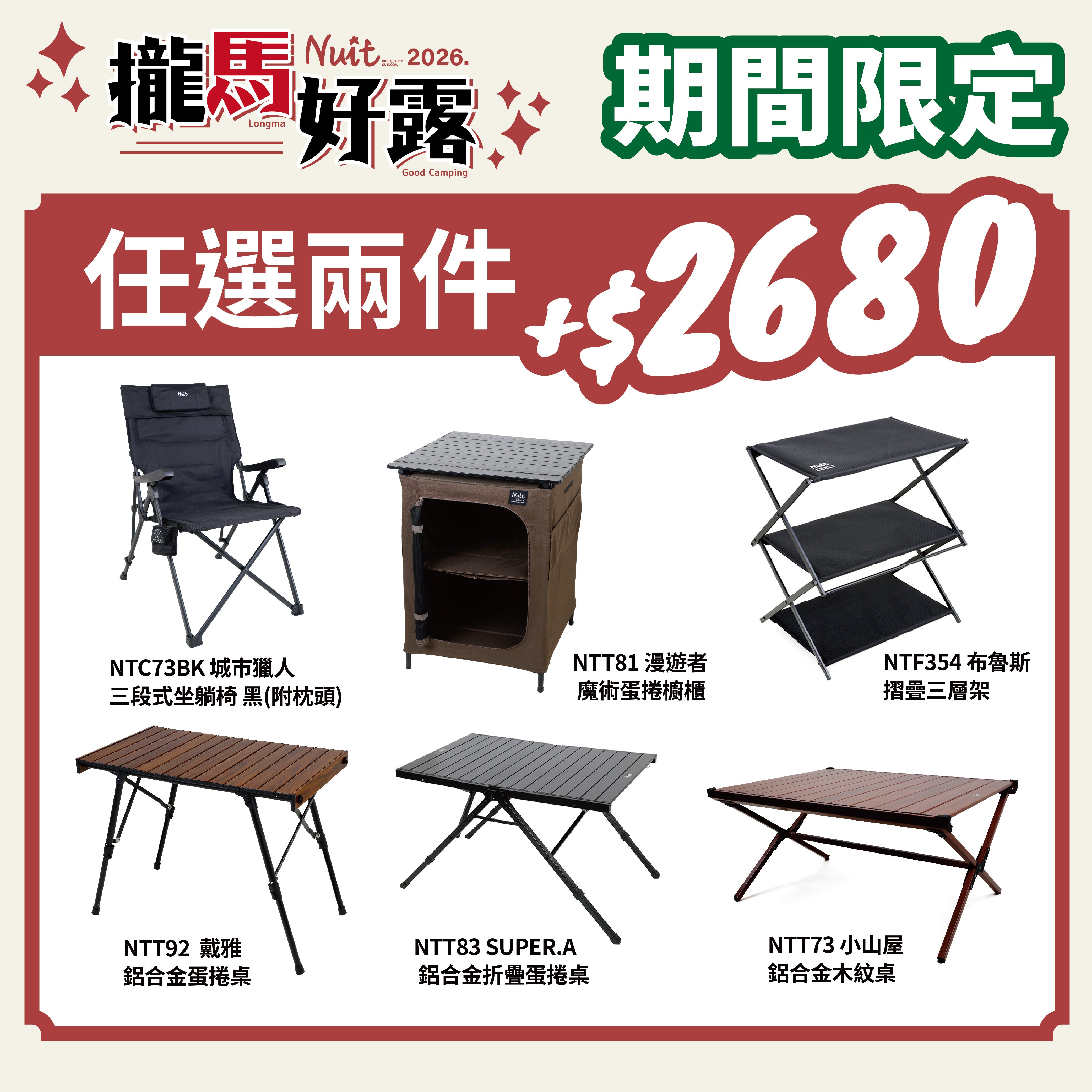 【2026攏馬好露-指定品項兩入優惠$2680】努特NUIT兩件任選任搭露營椅蛋捲桌三層架鋁合金折疊桌木紋桌櫥櫃